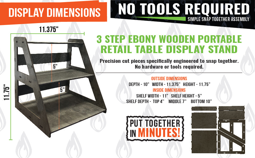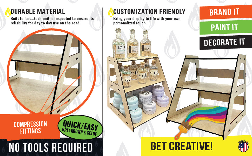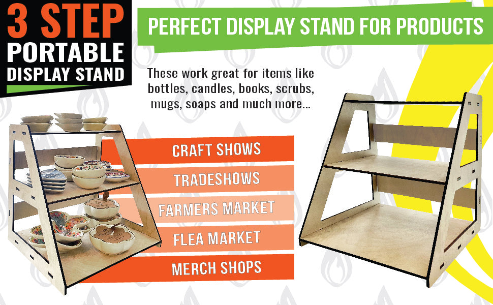 Introducing the 3-Tier Retail Table Display Stand with Shelves, a versatile and practical solution for showcasing your products in various settings. This 3-step riser display rack is the perfect choice for retail table tops, counter displays, craft shows, farmers markets, and presenting items like candles, jars, and bath and body products.